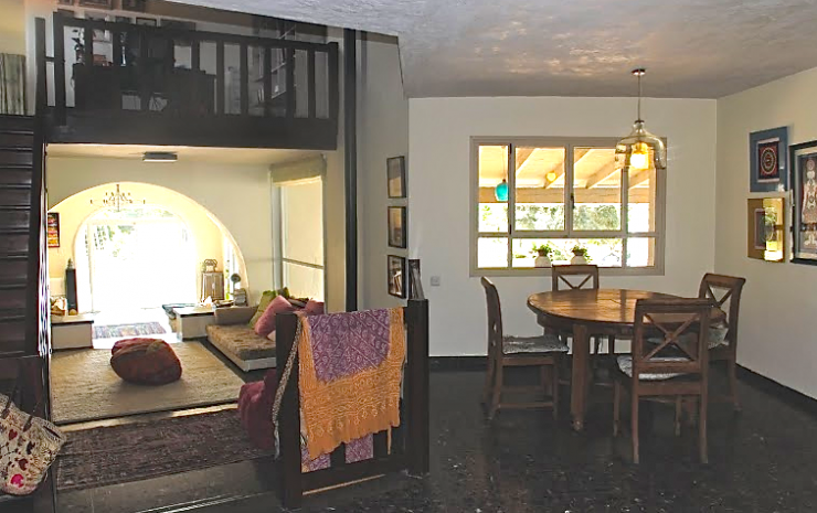קומת הכניסה – חלל הכניסה לבית מואר ומרווח, בבית שני סלונים אחד קטן ואיטינמי – פופים ומזרנים סביב הקמין ממנו יורדים לסלון הגדול והמואר בחלל ספות רחבות וספות רביצה שבקלות יהפכו בערב למיטה זוגית. מטבח הבית צבעוני – בריקס חום אדום וארונות טורקיז שולחן אוכל ציורי – וכל החגיגה הזאת מאובזרת בתנור אפיה, כיריים, מדיח מקרר ענק וכל הכלים והאביזרים שתרצו בכדיי לבשל ארוחה ססגונית וטעימה. עכשיו רק צריך לחשוב איפה לאכול? אפשר בשולחן הציורי במטבח (6 סועדים), או בפינת האוכל מול הכניסה הצופה לגינה הענקית ופסל הבודהה (6 סועדים), או לאכול במרפסת הגדולה בה שולחן אוכל ענק ל 12 סועדים.
